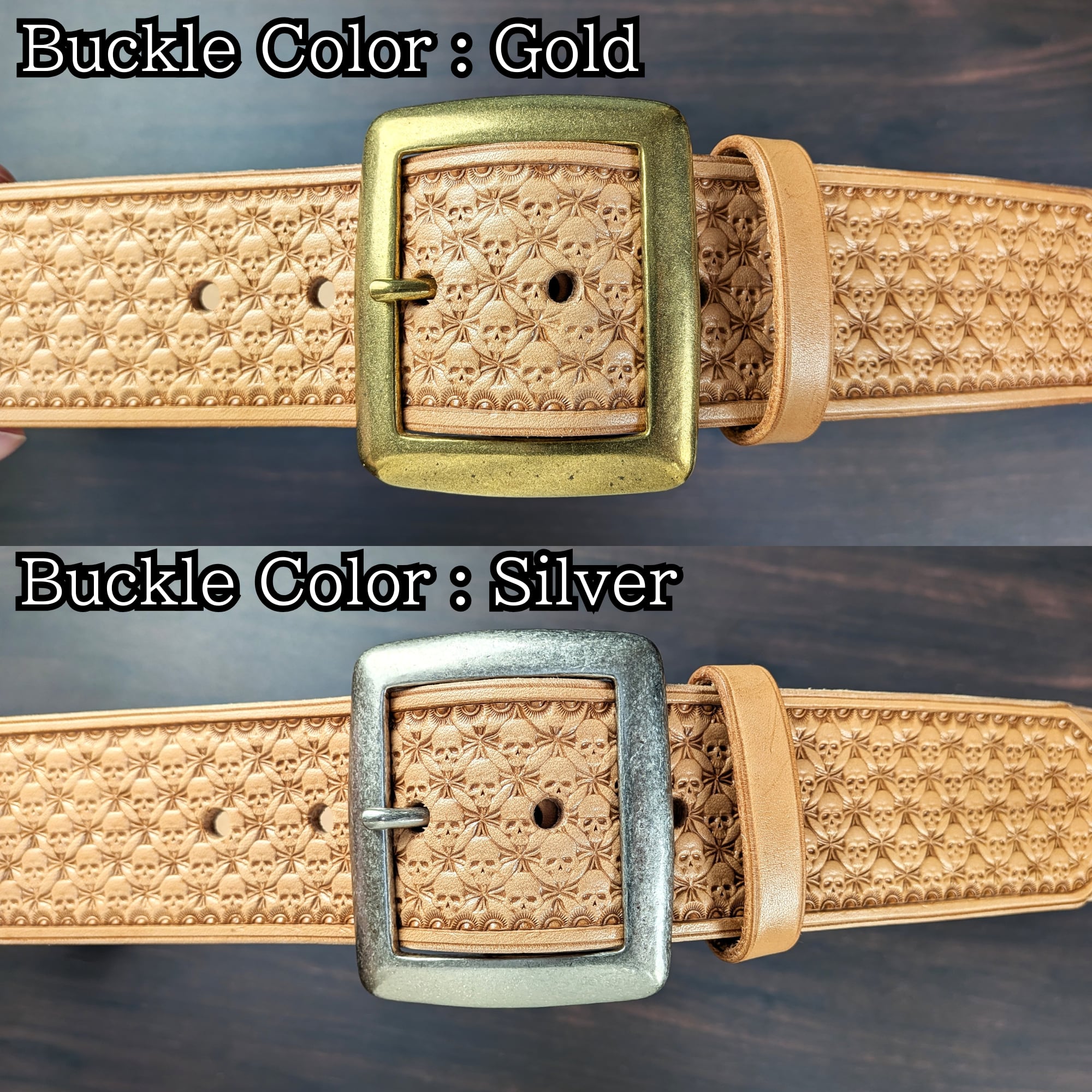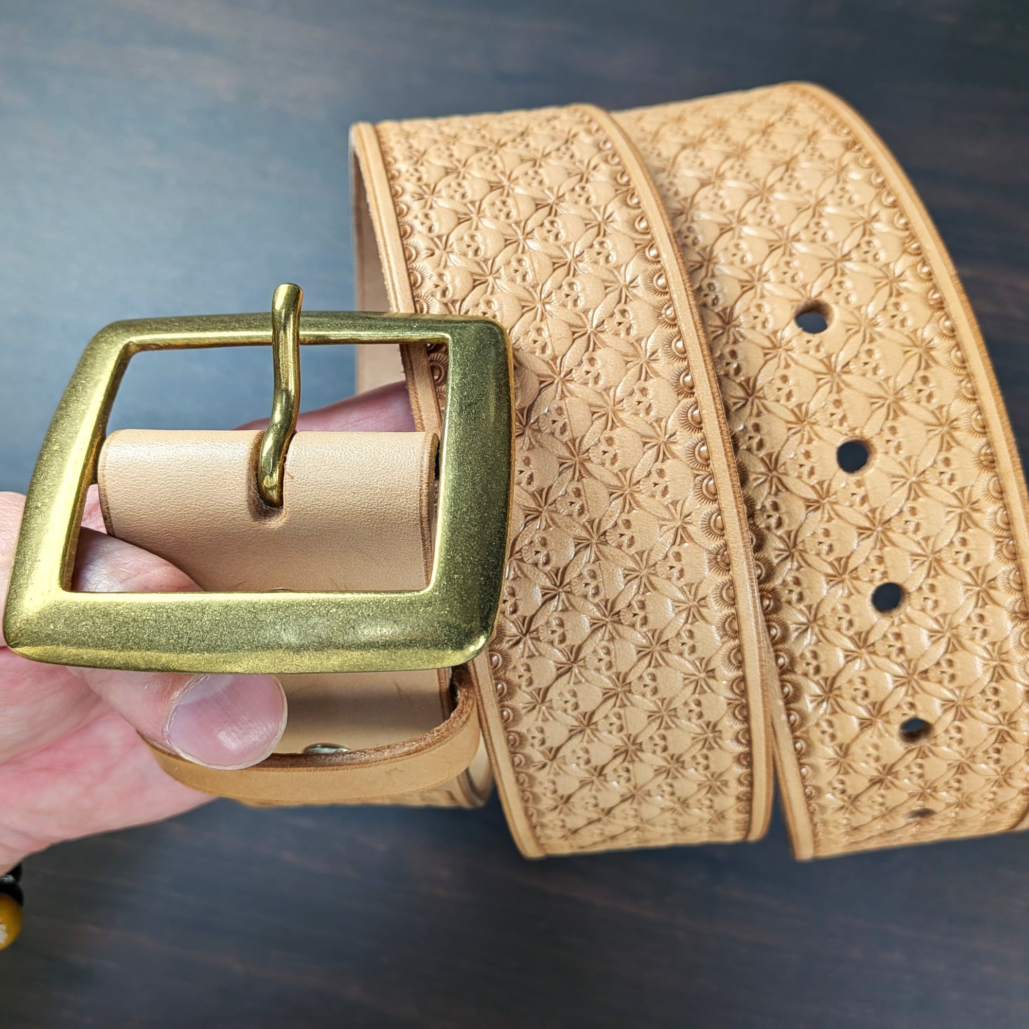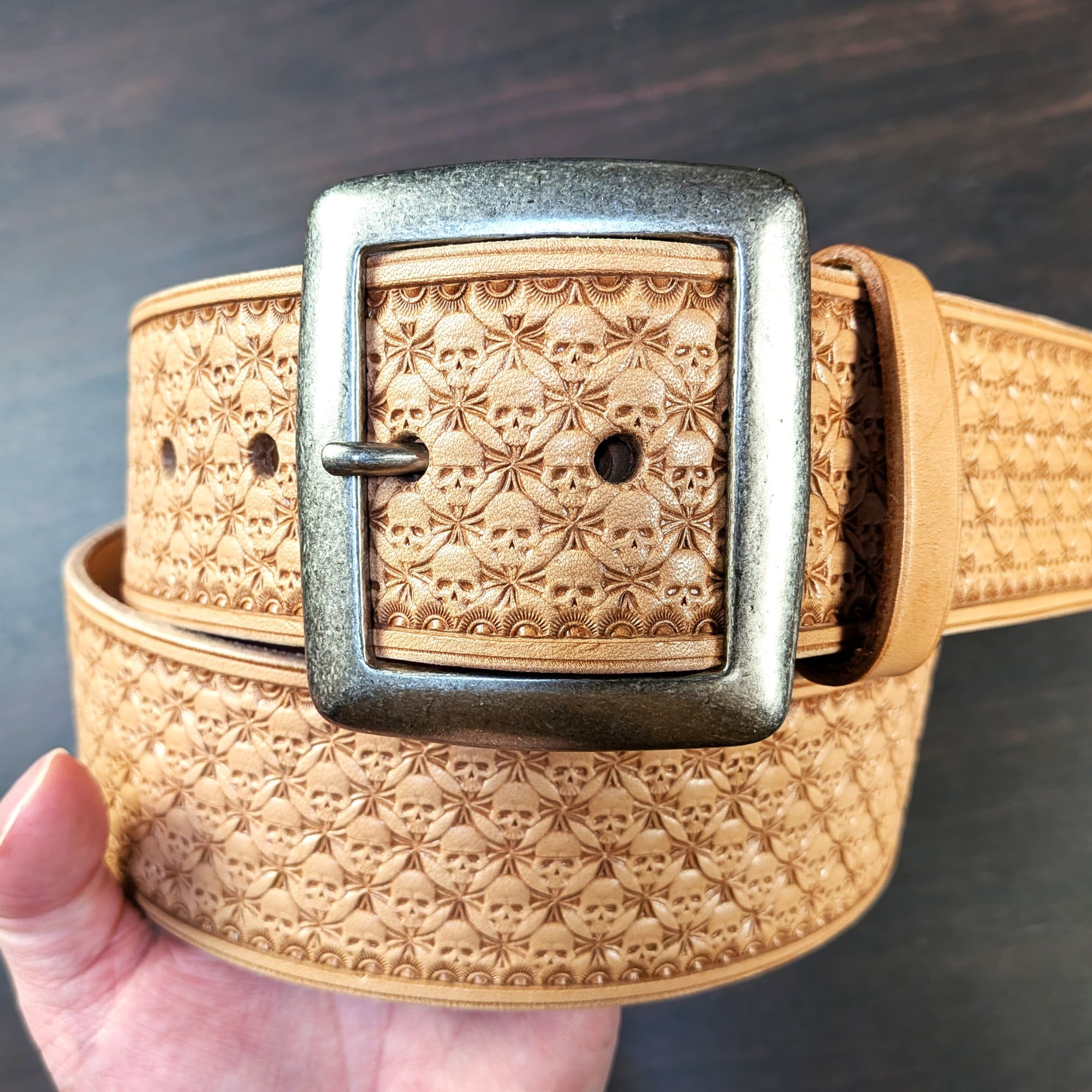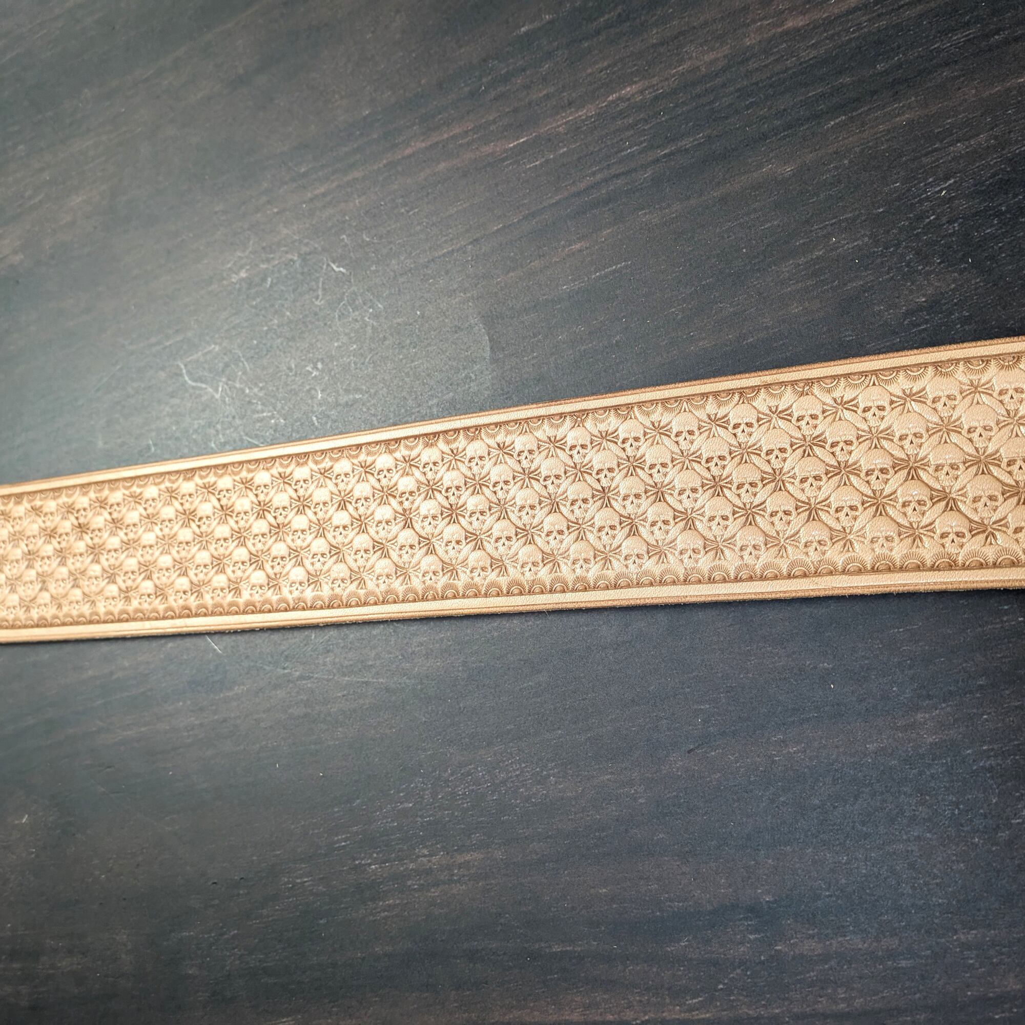 ベルト全面に、オリジナルのスカル柄ボックススタンプを一つ一つ丁寧に打ち込み、仕上げています。型押しや量産では表現できない、彫りの深さと立体感が特徴です。